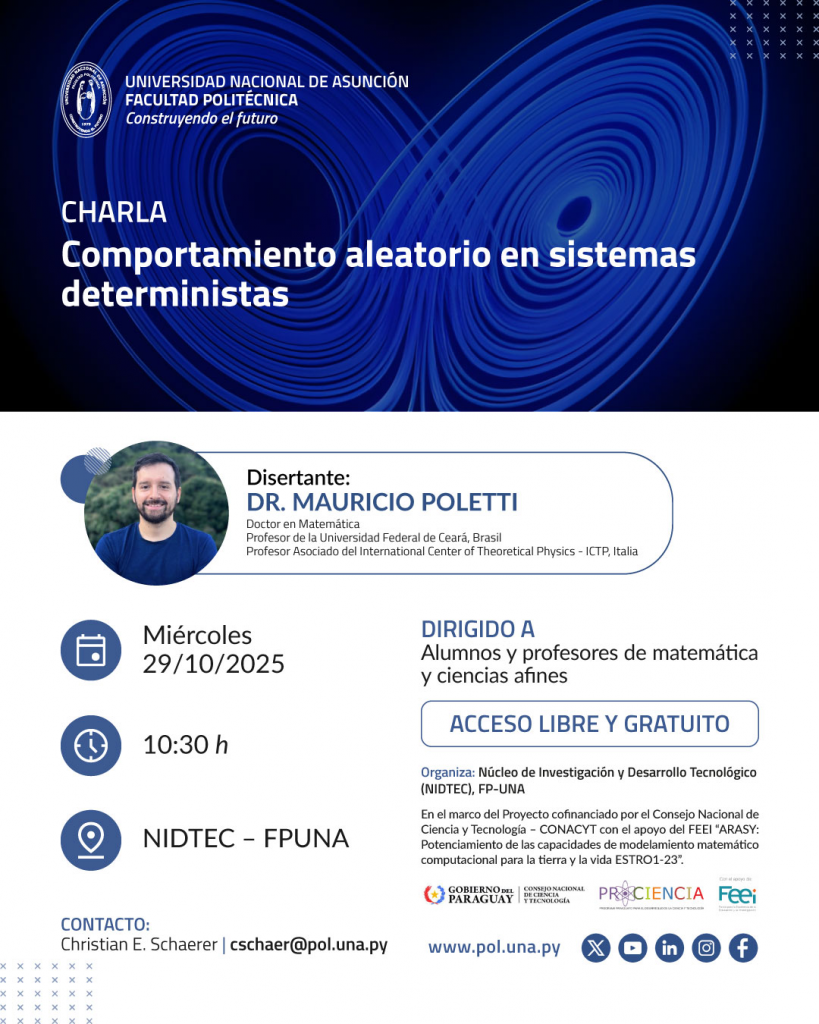 Charla: Comportamiento aleatorio en sistemas deterministas 17 octubre, 202517 octubre, 2025 admin Miercoles 29 de octubre 10:30 H NIDTEC- FP-UNA