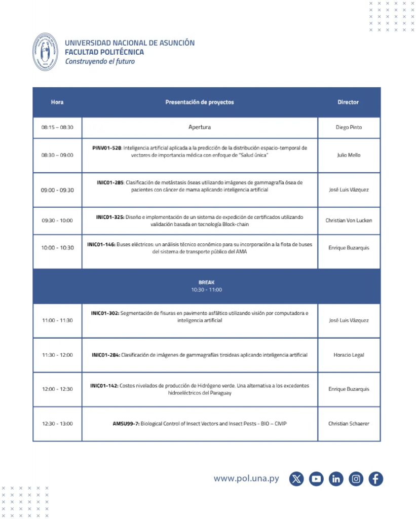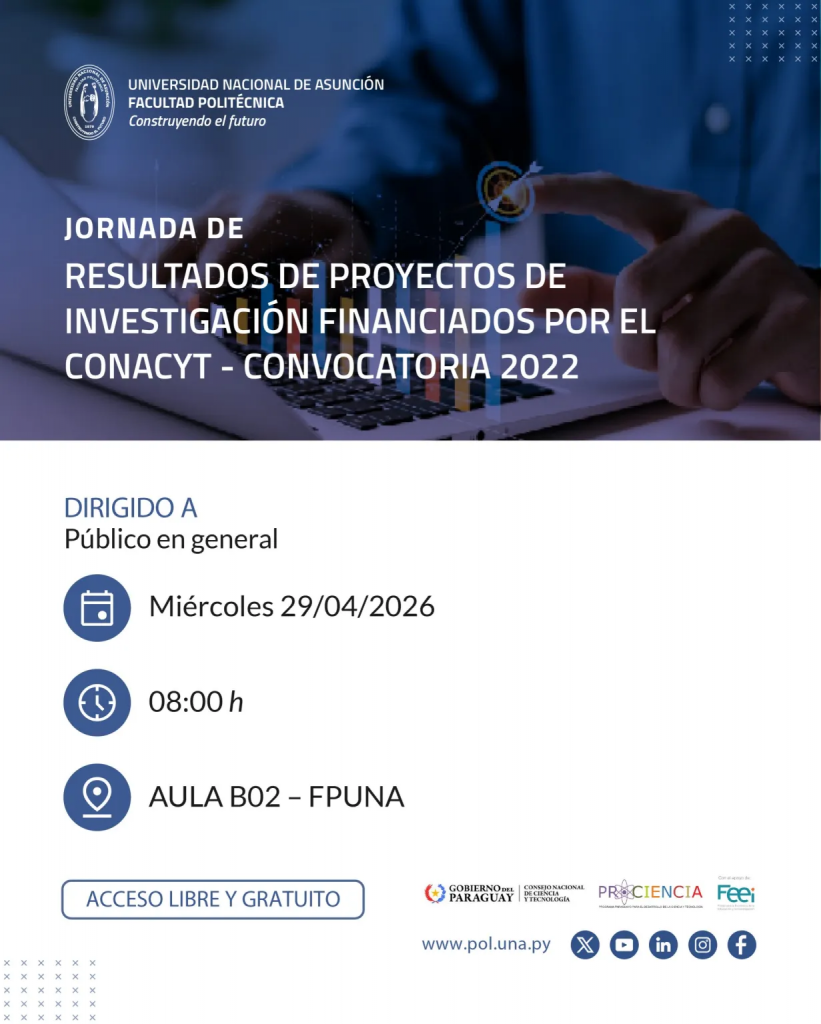 Jornada de Resultados de Proyectos de investigación financiados por el CONACYT – Convocatoria 2022 22 abril, 2026 admin El evento será realizado el dia Miercoles 29/04/2026 a las 8:00hs en el Aula B02