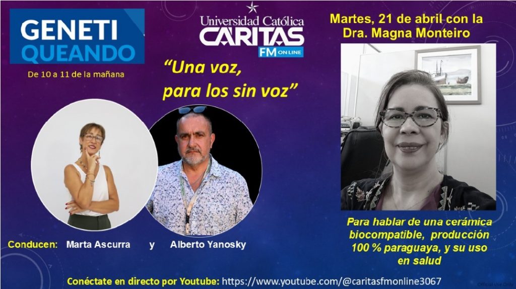 El martes 21 de abril la Dra. Magna Monteiro participó en una edición de GENETIQUEANDO para hablar de la producción 100% paraguaya, una cerámica biocompatible, que es la hidroxiapatita, una cerámica de fosfato de calcio, con aplicaciones en la salud y remediacion medio ambiental.
